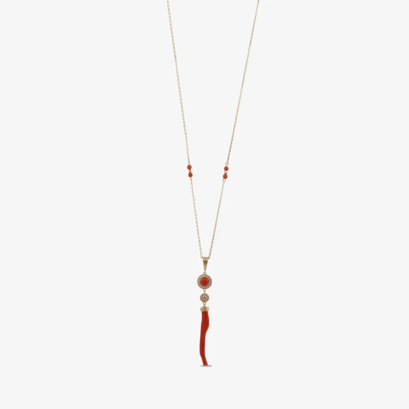 The design’s delicate, vertical structure elegantly elongates the neckline, creating a dignified look. The balance between the warmth of 18k yellow gold, the clarity of diamonds, and the iconic red of coral transforms this piece into a living work of art. It was specially designed for those who wish to carry this unique coral form, shaped by nature over thousands of years, with modern elegance.