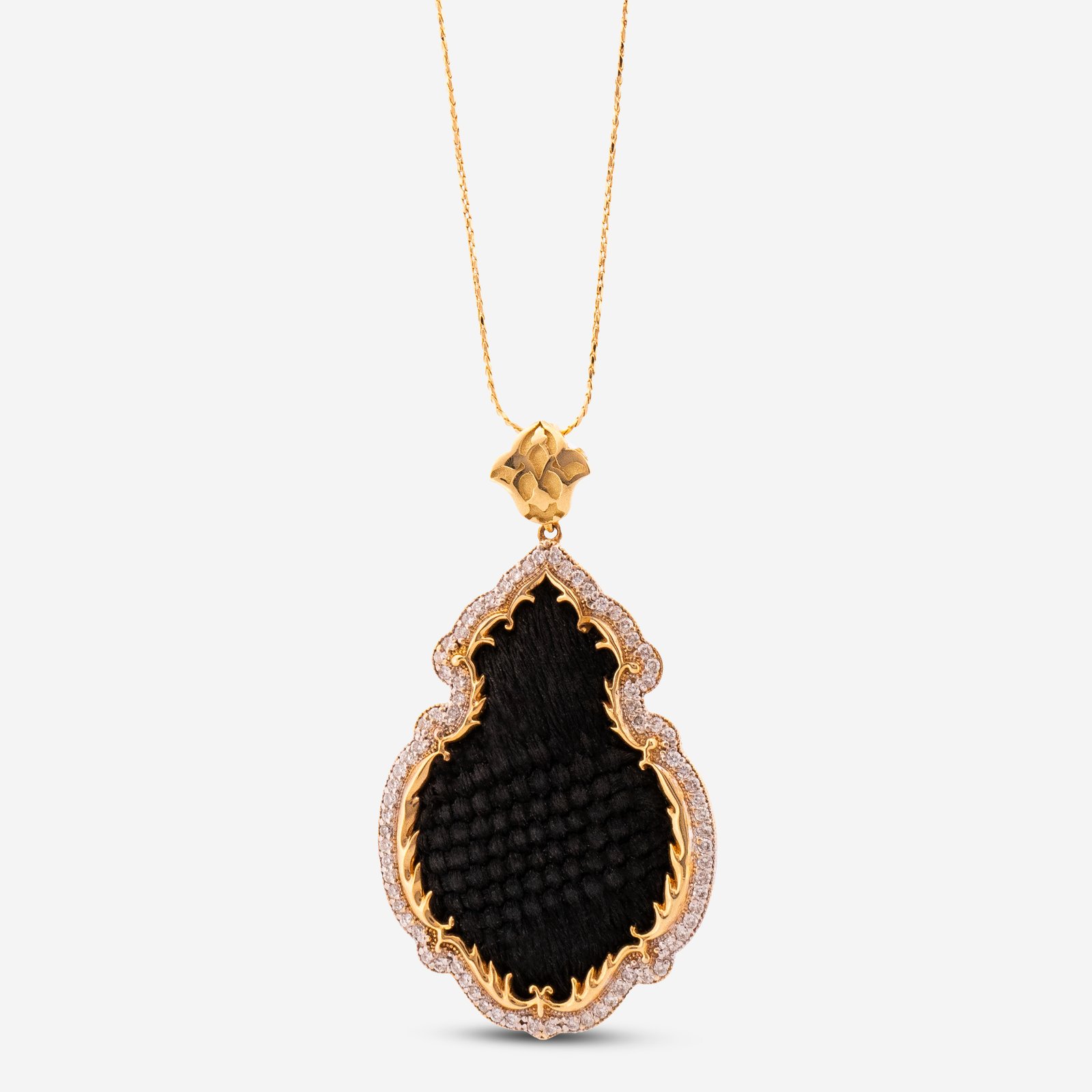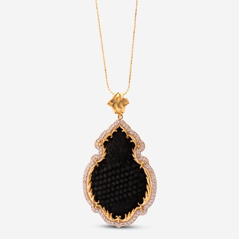 The double row stone setting, a distinctive feature of the design, has been meticulously applied to vertical channels using the micro-setting technique. This method ensures the stones are seamlessly integrated into the metal body, making the design’s outer frame more pronounced and voluminous. The double-stone gold necklace is completed by transferring traditional motifs from the Kaaba cover onto the gold surface using micro-casting techniques. The high-standard polishing process used highlights the homogeneous shine of the metal and the clarity of the motifs.