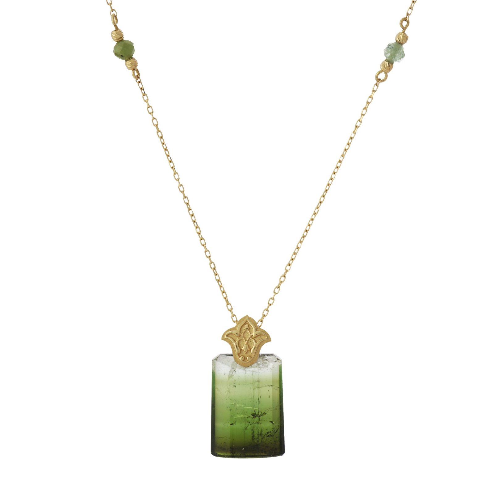 Crafted from high-quality 18-karat gold, this piece features a stylized tulip motif that elegantly embraces the Tourmaline stone. This cultural motif crowns the necklace’s natural beauty with traditional elegance. The gold beads and small green stone details on the chain complete the necklace’s overall harmony.