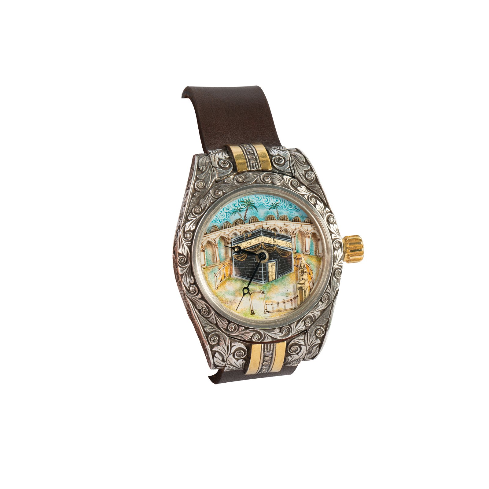 Saatin her bir detayı, ustalıkla işlenmiş motifleri ve zarif pırlantalarıyla göz kamaştırır. Geleneksel sanatların inceliğini yansıtan bu özel tasarım, sizi zamanın ötesine taşıyarak kalıcı bir değer sunar. Mukaddes Saati, hem bir aksesuar hem de ruhunuza dokunan, anlam dolu bir yadigârdır.
