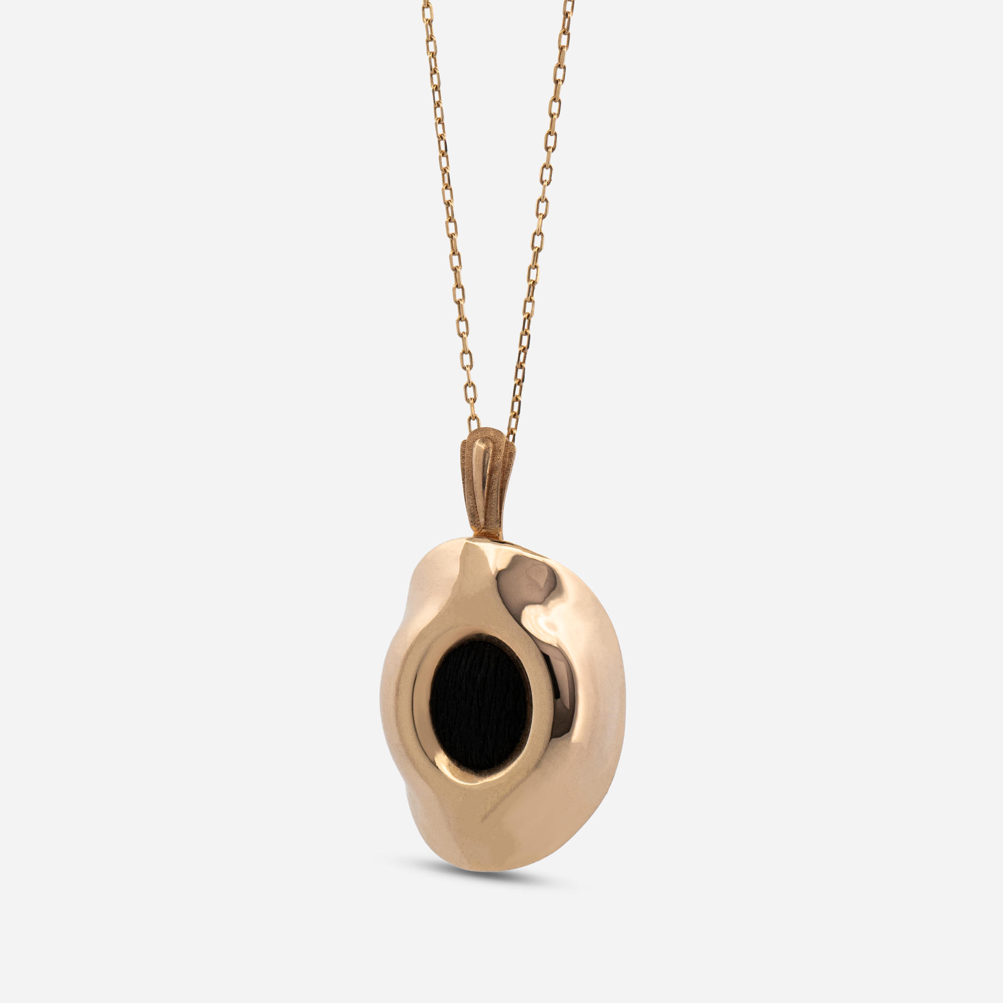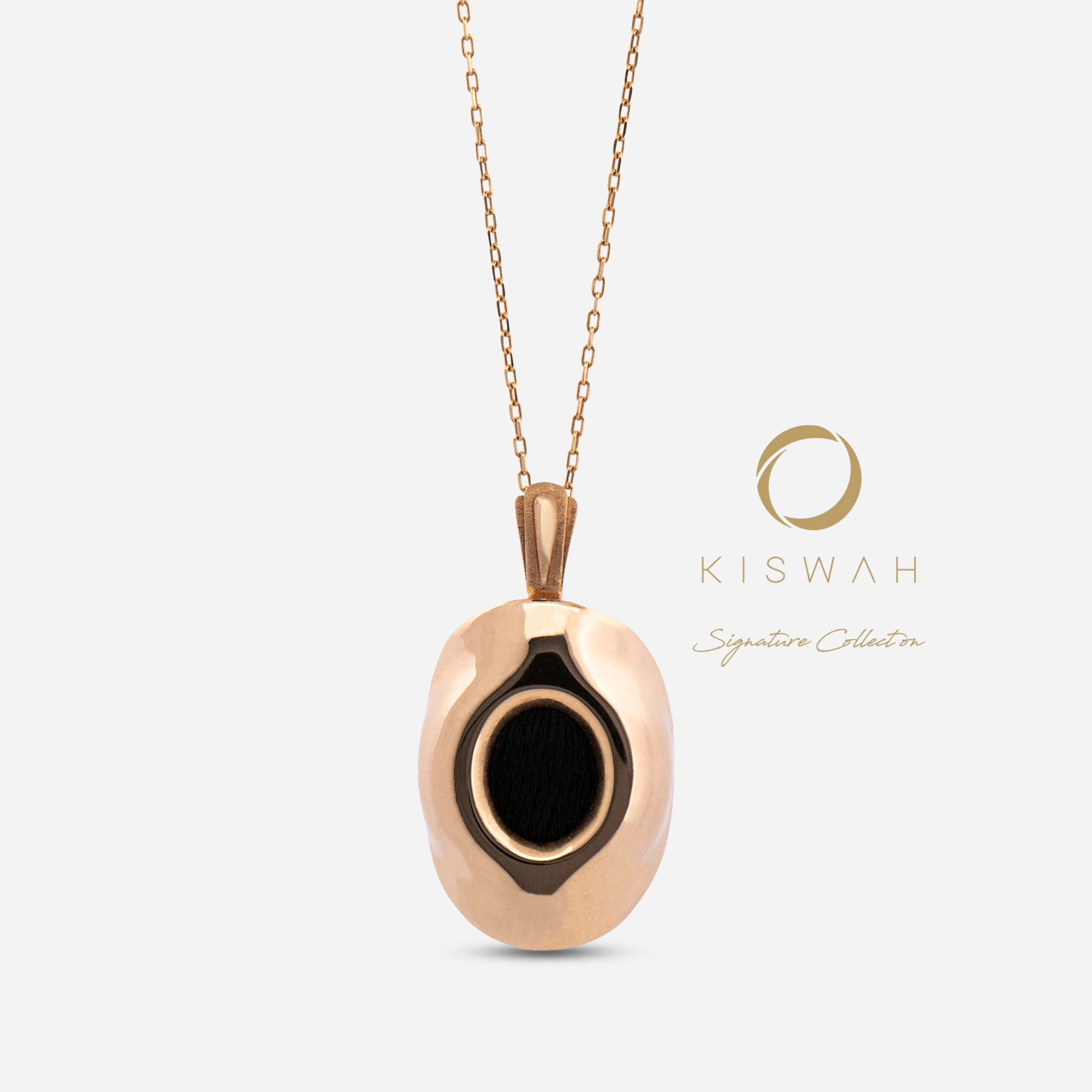 In Kiswah Heritage’s design journey, “Hajar al-Aswad” represents both a color and a stance. 925 Sterling Silver Kaaba Covered Hajar al-Aswad Necklace redefines heritage with a modern and organic form, stepping outside traditional lines. The fluid, wavy structure of the necklace’s pendant reflects light from different angles, highlighting the depth of the black fabric at its center.