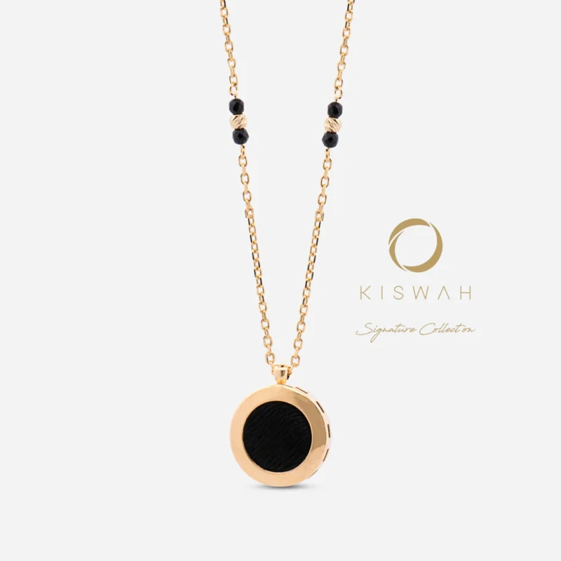 Some designs act as a time tunnel with the symbols they carry. This special necklace from Kiswah Heritage features the texture of the Kaaba cover, one of the world’s most ancient textile arts, on one side, while embodying the unwavering aesthetics of calligraphy on the other. The calligraphy engraved on the back creates a visual signature by combining the fluid form of the letters with stones sparkling like diamonds.