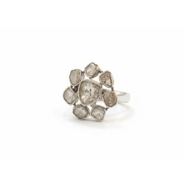 A unique design that brings the unprocessed, pure beauty of nature to your fingertips. Each raw diamond, with its own unique shape and sparkle, comes together on a silver setting in the shape of a flower. Unlike the classic sparkle of diamonds, this ring offers a rustic and authentic elegance. It is an eye-catching and meaningful piece that will complete your everyday style. Add a natural and bohemian touch to your style with this unique design.