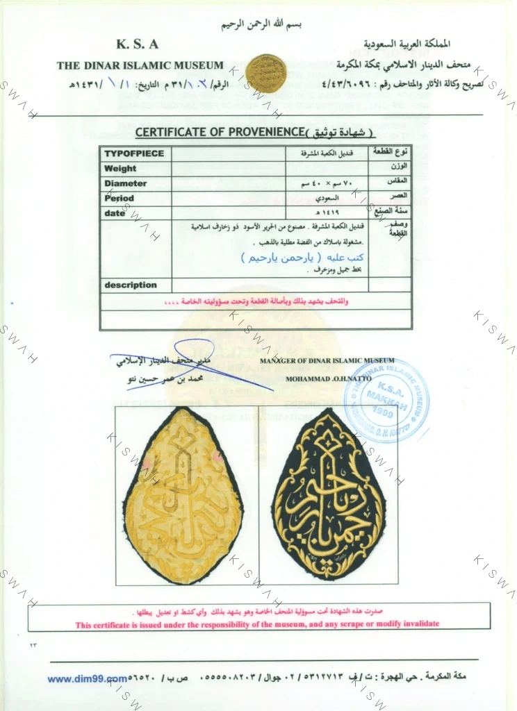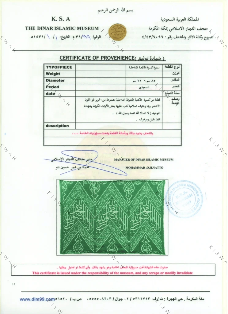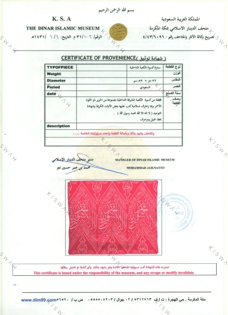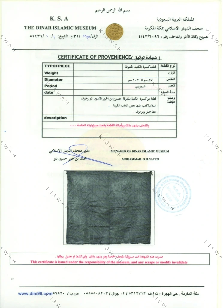 In accordance with Hajj traditions, every year on the ninth day of the month of Dhu al-Hijjah, the Kaaba is covered with a new kiswa, and the old covering is cut into pieces of various sizes and given as gifts to important figures.