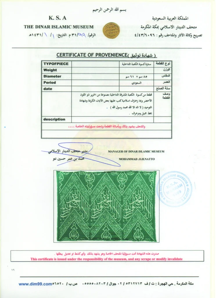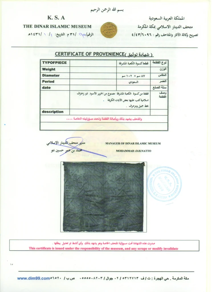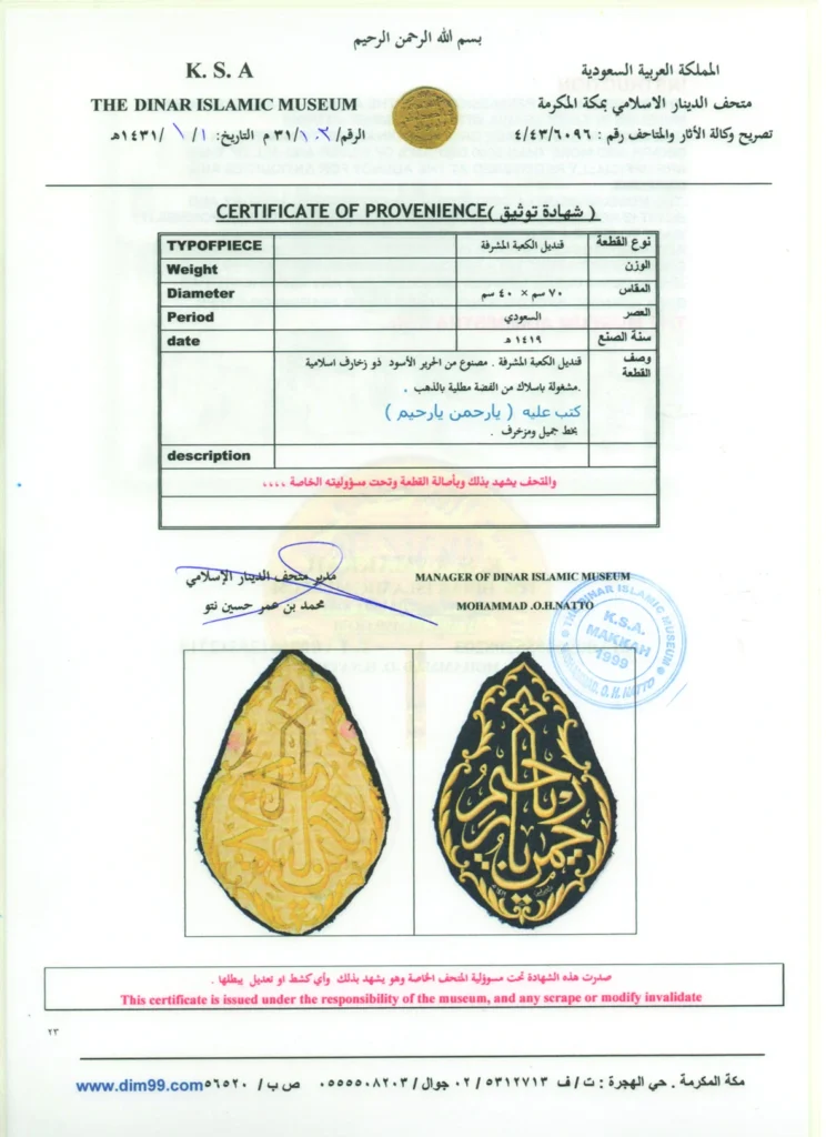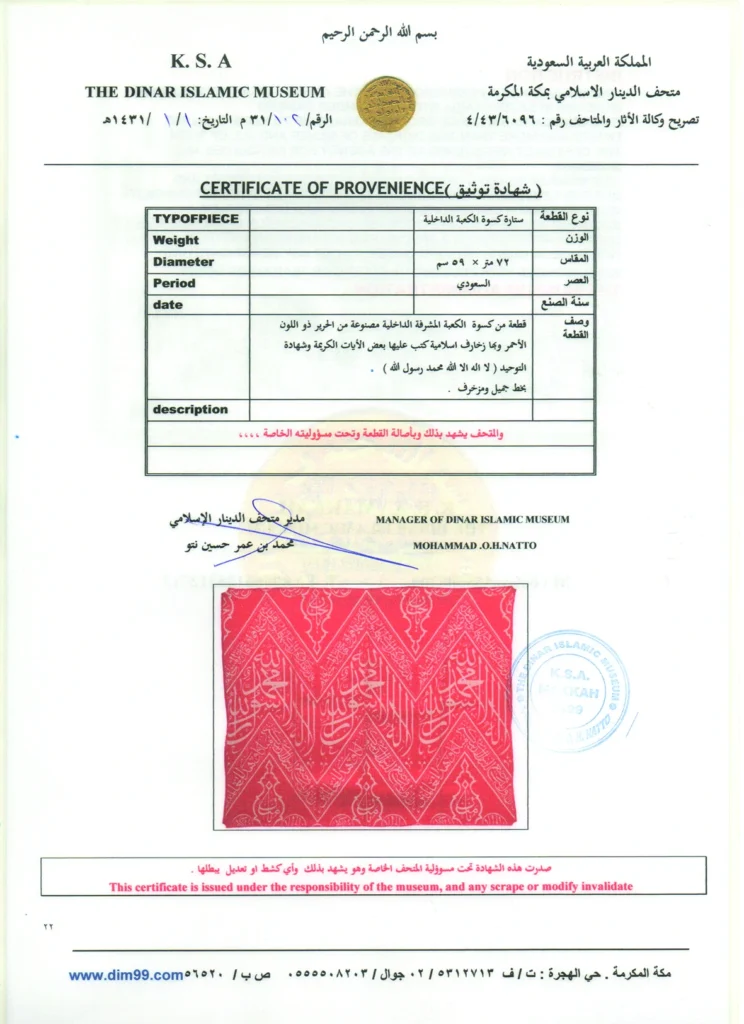 Suud dönemi örtülerimizin Mekke İslami Dinar Müzesi tarafından orijinalliği tescil edilmiştir.