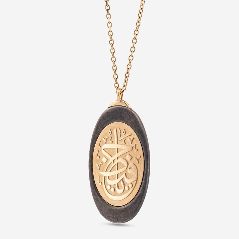 Gövdede kullanılan füme (oksitlenmiş) altın, merkeze yerleştirilen parlak sarı altın hat motifini ön plana çıkararak zıtlıkların yarattığı zengin bir doku sağlar. Bu sanatsal kontrast, kolyeye benzersiz bir derinlik ve asalet katar. Yükseltilmiş hat yazısı, kolyeye üç boyutlu, bir imza veya mühür hissi verir.