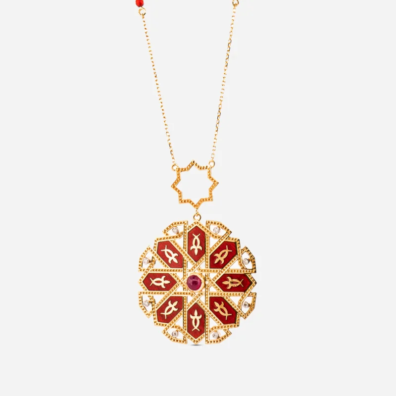 Geometrik Kusursuzluk ve Selçuklu Mirası Tasarımın temelini oluşturan sekiz köşeli yıldız formu, Selçuklu mimarisinin ve İslam sanatının en güçlü sembollerinden biridir. Merhamet, şefkat ve sabır gibi sekiz farklı erdemi temsil eden bu form, kolyenin her bir bölmesinde yer alan kırmızı mine işçiliği ve altın kakma figürlerle zenginleşir. Tasarımın tam kalbinde yer alan yuvarlak kesim yakut, hayatın merkezini ve sönmeyen enerjiyi simgelerken; çevresindeki pırlanta dokunuşları bu mistik yıldızı bir ışık halesi gibi sarar.