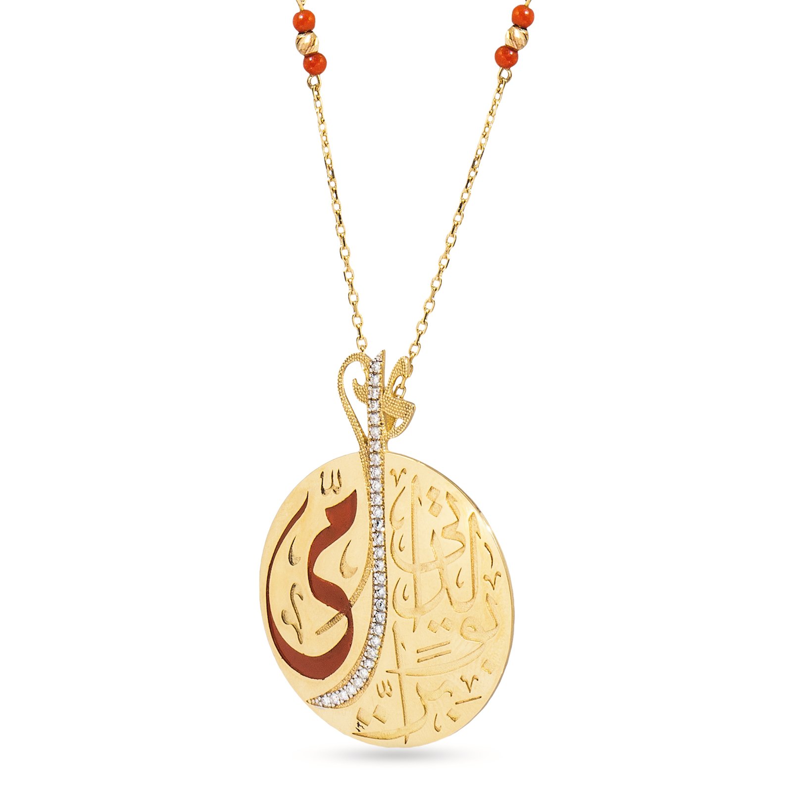 Bu versiyonun en çarpıcı özelliği, hat sanatının bir kısmının canlı kırmızı mine (emaye) ile renklendirilmiş olmasıdır. Bu tutkulu kırmızı detay, altın oyma hat sanatına derinlik katarken, kolyeye dinamik ve göz alıcı bir enerji verir. Madalyon üzerindeki hat motifi, pırlantaların kesintisiz ışıltısıyla vurgulanarak tasarıma lüks bir ihtişam katar.