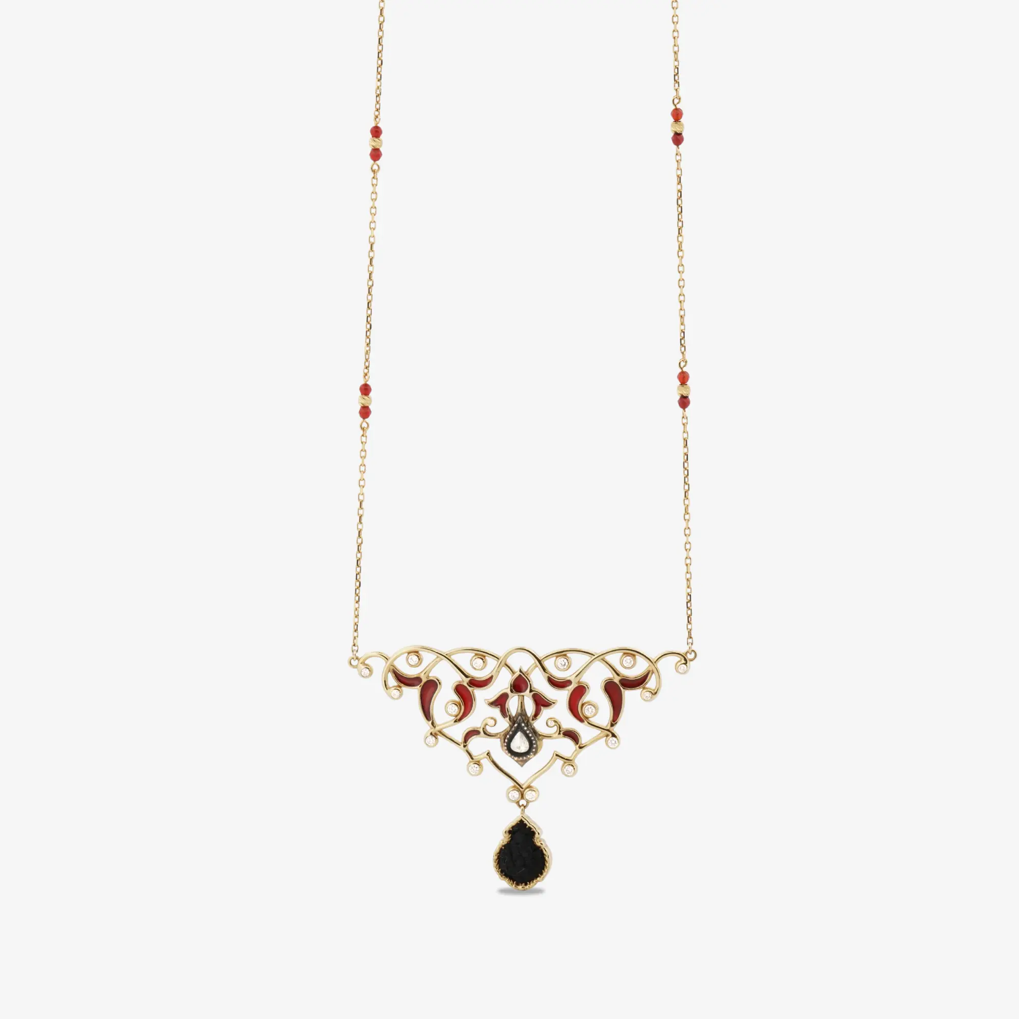 Sanatkarane Detaylar ve Manevi Derinlik 18 ayar altının zarafetiyle şekillenen kolyenin üst kısmında, hat sanatının kıvrak çizgilerini ve saray mimarisinin estetik kıvrımlarını anımsatan el işçiliği yer alır. Bu altın kafes üzerine titizlikle yerleştirilen pırlantalar, manevi bir nuru simgelerken; kırmızı mine dokunuşları tasarıma antik bir derinlik katar. Kolyenin merkezinde, bir damla formunun içine yerleştirilen orijinal Kabe örtüsü parçası, tasarımın ana odak noktasıdır. Siyahın asaleti ve üzerindeki kadim doku, bu kolyeyi dünyevi bir aksesuardan öteye taşıyarak bir “yaşayan tarih” haline getirir.