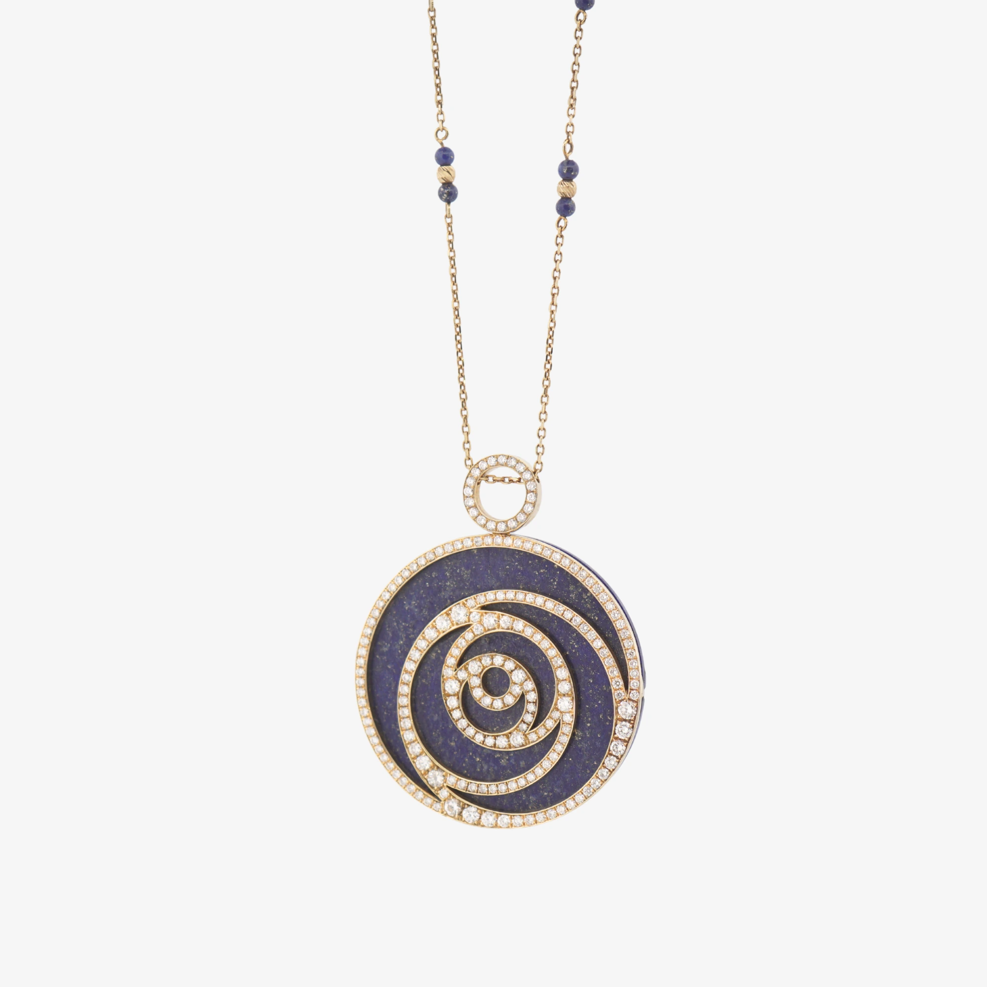 Merkezde, gökyüzünün derinliğini yansıtan, yoğun lacivert Lapis Lazuli taşı yer alır. Bu asil taşın üzerinde, tamamı pırlantalarla çevrili sarmal (girdap) motifleri yükselir. Bu motifler, tasarıma boyut ve dinamik bir hareket katarken, pırlantaların kesintisiz ışıltısı, lacivert zemin üzerinde yıldızlar gibi parlar.