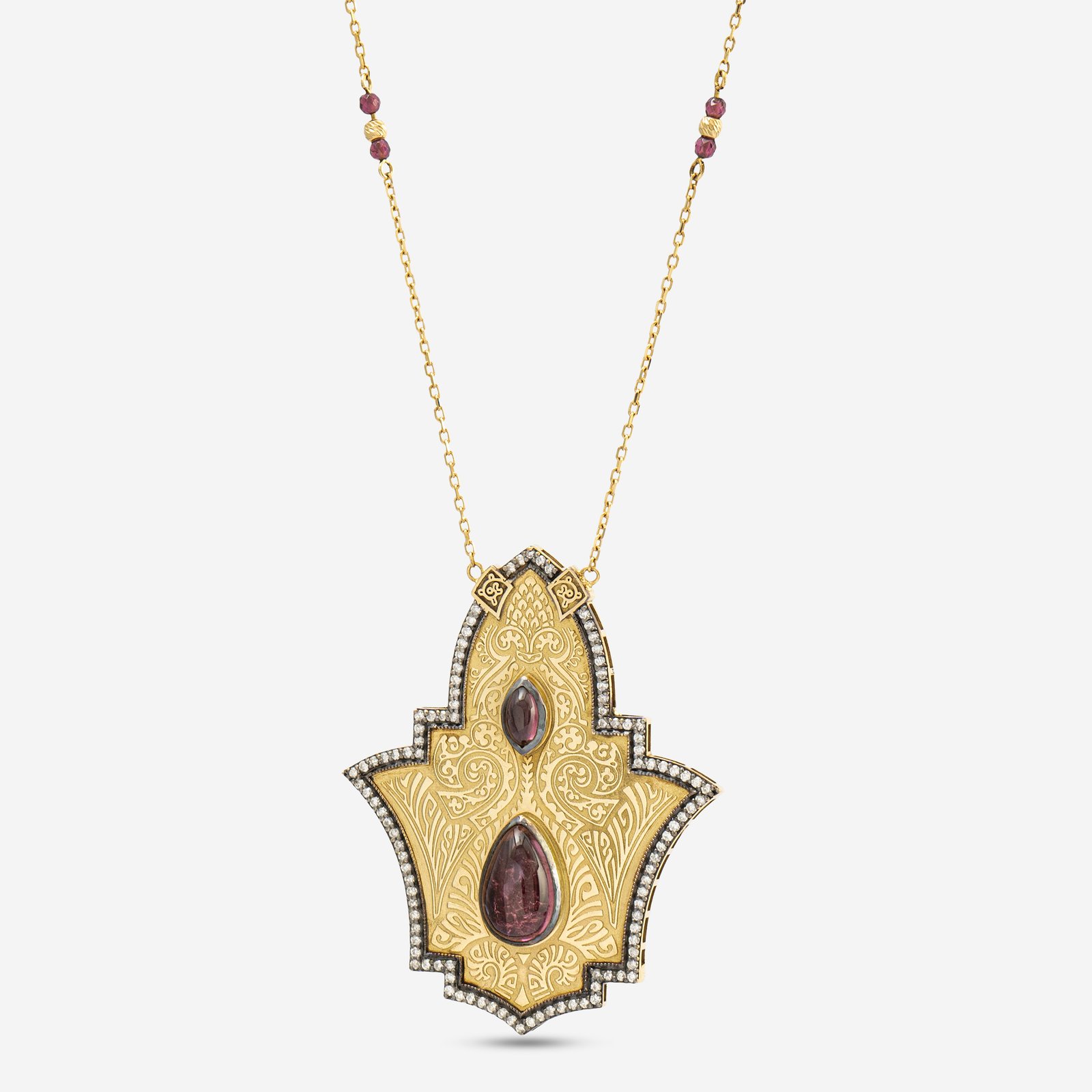 Merkezdeki yoğun yakut kırmızısı mine (Lal rengi), tasarıma derinlik ve mistik bir enerji katarken, üzerine işlenen akıcı hat sanatı motifi, kolyeye sanatsal bir imza görünümü verir. Pırlantaların kesintisiz ışıltısıyla çevrelenen bu madalyon, kırmızı minenin derinliğiyle çarpıcı bir kontrast oluşturarak gizemli bir lüks sunar.