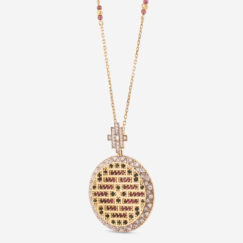 Saray Bahçesi Kolyesi, Osmanlı ve Arap saraylarının sanatsal zenginliğinden ve lale, karanfil gibi motiflerle dolu bahçelerinin huzurundan ilham almıştır. Kolyenin yuvarlak formu, içindeki zümrüt ve yakut taşlarının (veya minelerinin) oluşturduğu karmaşık geometrik mozaik desenle bezenmiştir. Bu desen, geleneksel çini sanatının zamansız estetiğini yansıtır.