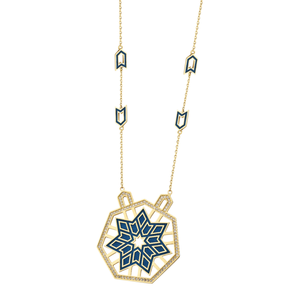 Yıldız-ı Selçukî Pırlanta Kolye, adını Selçuklu mimarisinin ve sanatının en önemli motiflerinden olan yıldızlardan alır. Bu özel tasarım, geometrinin kusursuz dengesini, pırlantaların göz alıcı ışıltısıyla birleştirir.