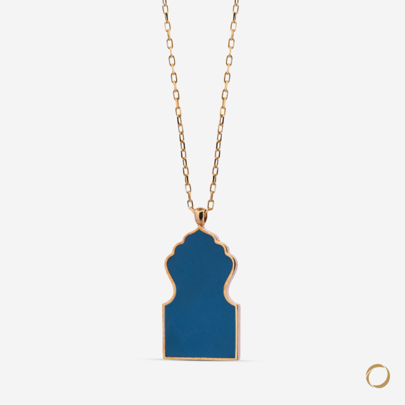 925 Ayar Altın Kaplama Gümüş Mavi Mineli Kolye, gümüşün asaletini altın kaplamanın sıcaklığıyla birleştirirken, mavi minenin dingin ve huzur veren rengiyle taçlandırılmıştır. Kolyenin dairesel formu, sonsuzluğu ve bütünlüğü simgelerken, üzerindeki ince detaylar titiz bir el işçiliğini gözler önüne serer. Bu kolye, hem gündelik stilinizde hem de özel anlarınızda size şıklık ve huzur katar.