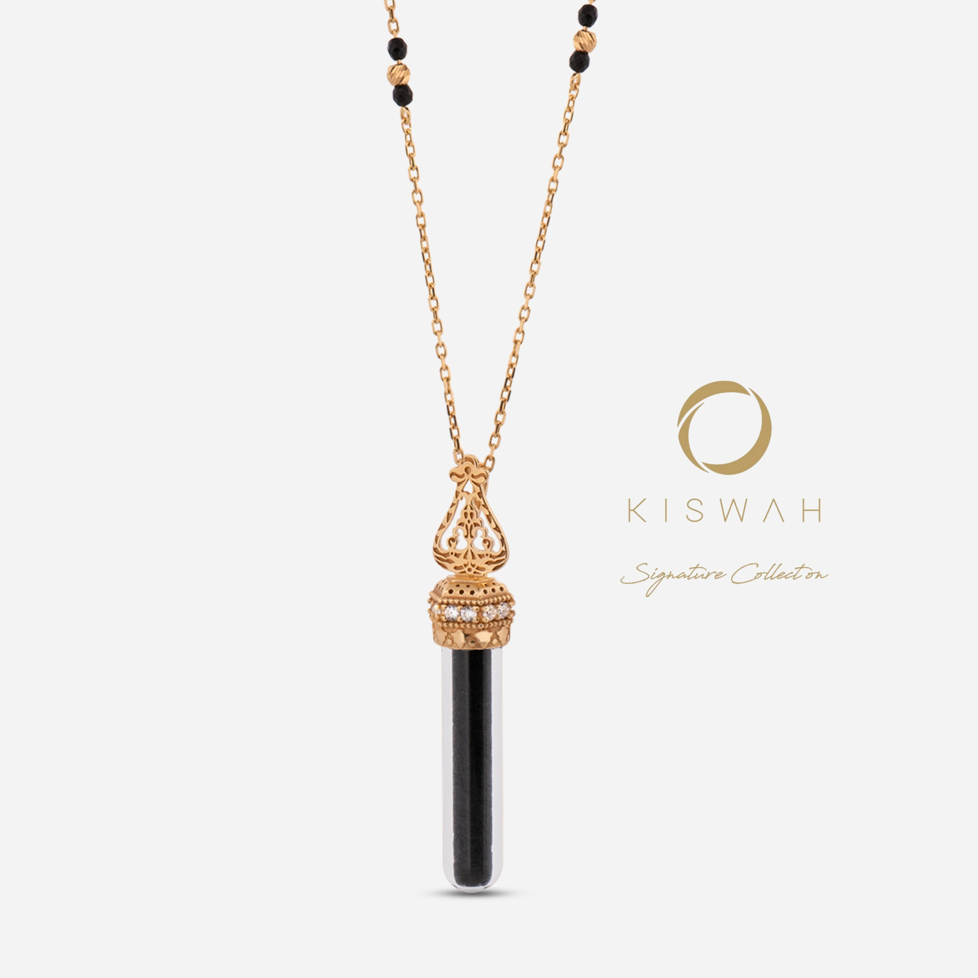 Sınırlı sayıda üretilen bu kolye, Kabe örtüsü sertifikası ve 1 ml Kabe kokusu ile birlikte özel bir kutuda sunulmaktadır.