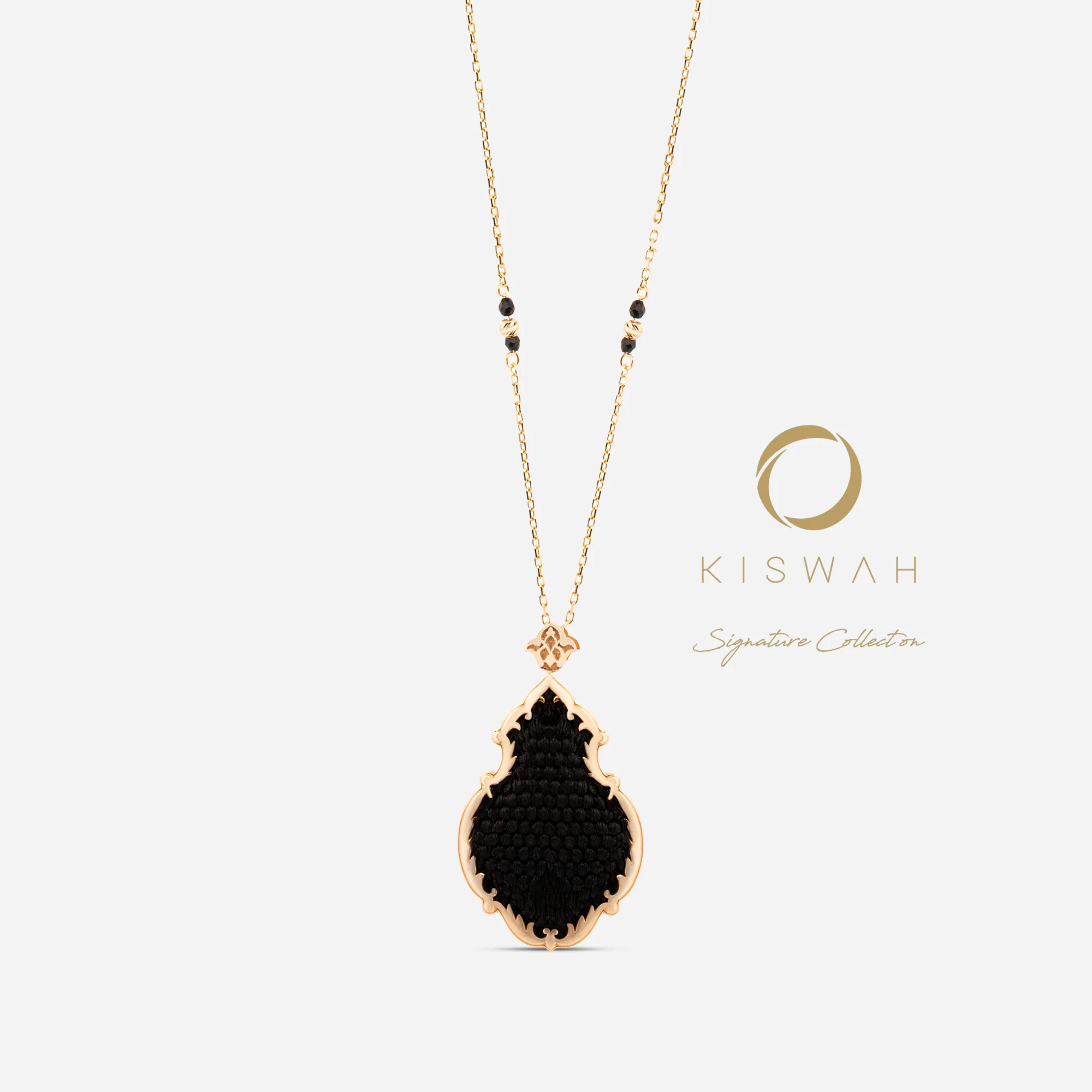Kiswah Heritage’ın manevi değerleri sanatla buluşturduğu koleksiyonunda yer alan bu kolye, Osmanlı’nın zarif kandil formunu Kabe-i Muazzam’ın mukaddes örtüsüyle birleştiriyor. 925 ayar gümüş üzerine uygulanan altın kaplama doku, kolyeye antika bir şemdan asaleti kazandırırken; merkezdeki Kabe örtüsü parçası tasarıma paha biçilemez bir manevi değer katar.