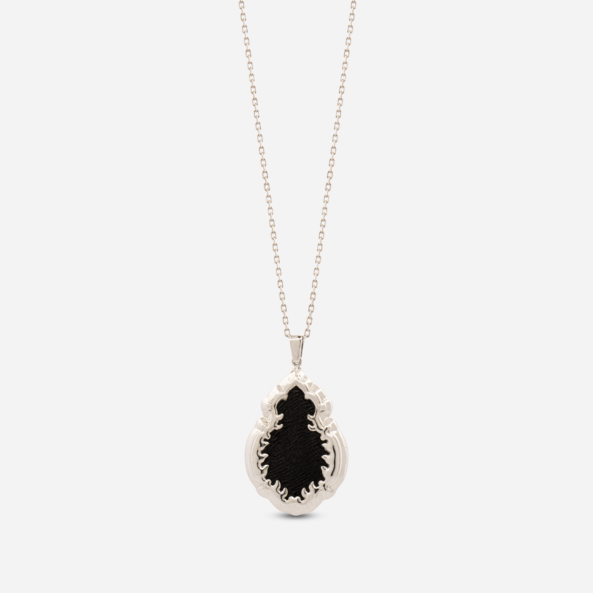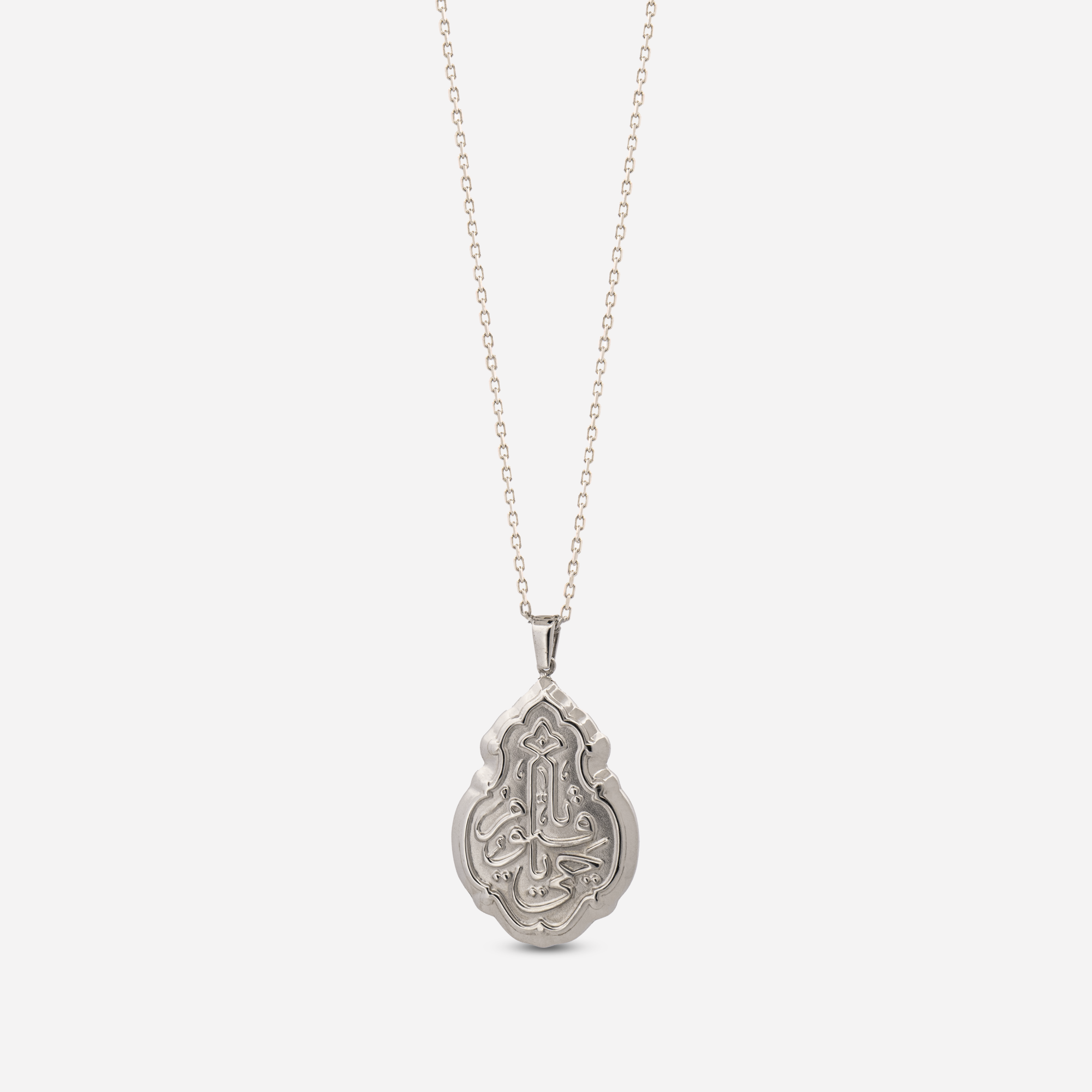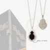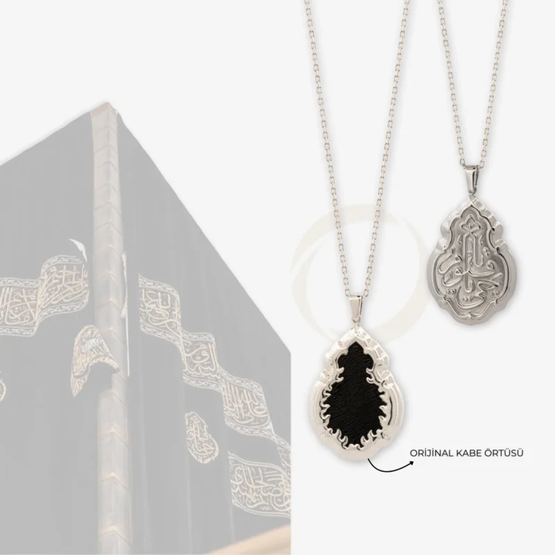 Bu özel tasarım kolye, Kâbe örtüsünün üzerindeki “kandil” formundaki kuşak yazılarından ilham alınarak titizlikle hazırlanmıştır. Bir yüzünde kutsal Kâbe örtüsünün vakur dokusu, diğer yüzünde ise Allah’ın 99 isimlerinden bazıları yer almaktadır.