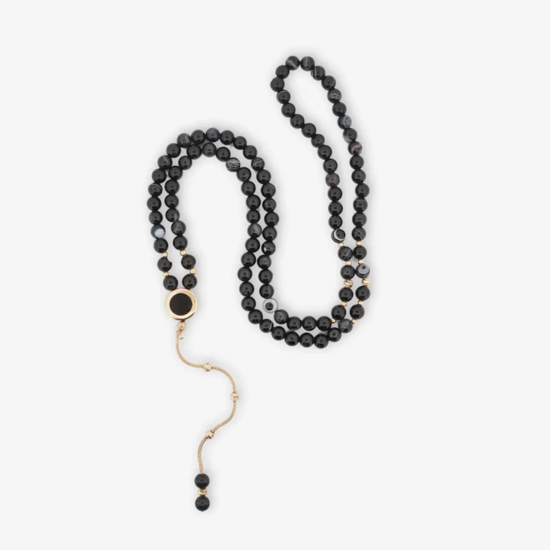 Kiswah Heritage, mukaddes bir parçayı modern bir zanaatkârlıkla avuçlarınıza bırakıyor. 925 ayar gümüş üzerine uygulanan altın kaplama dokunuşlar, siyah akik taşlarının pürüzsüz yüzeyiyle birleşerek kusursuz bir dokunma hissi sunar. Bu modeli diğerlerinden ayıran en belirgin özellik, imame ucundaki “vav” harfinin tevazu ve teslimiyetini andıran akışkan kordon tasarımıdır.