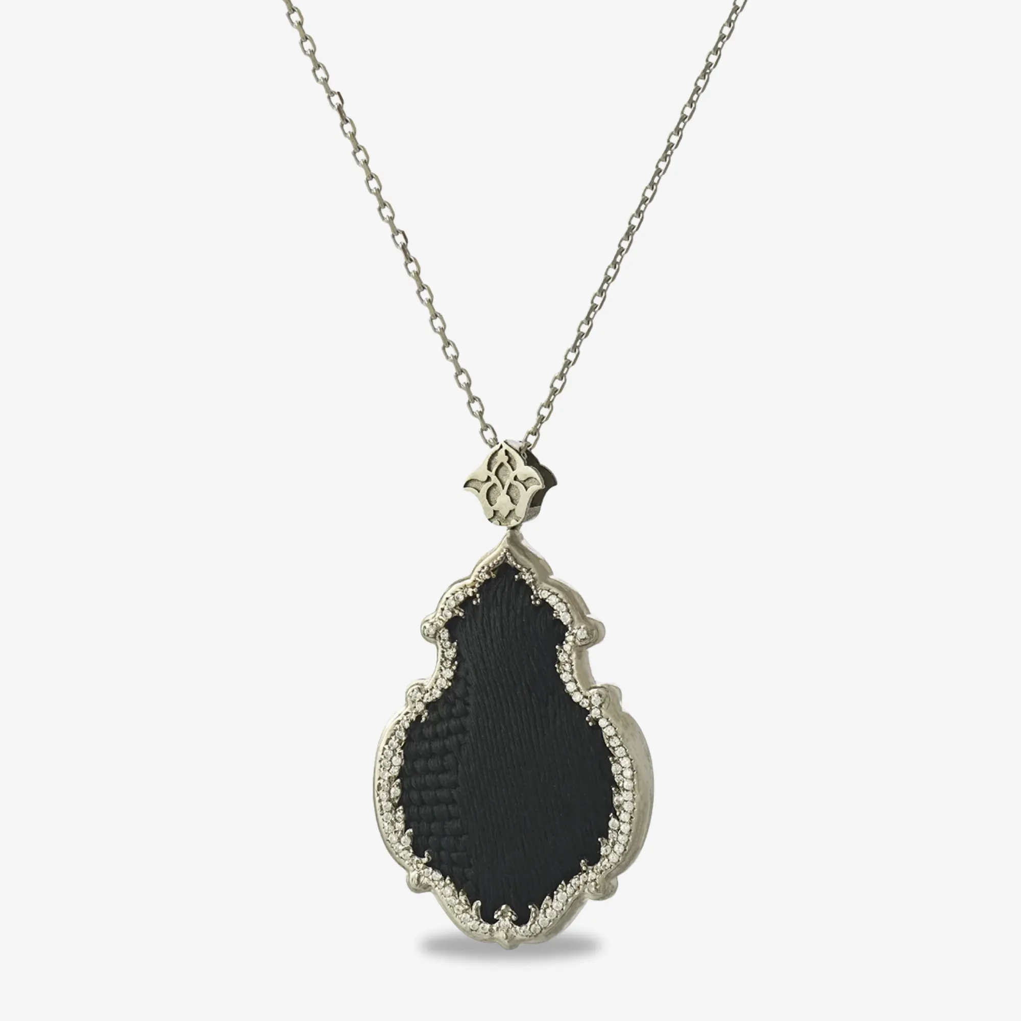 925 Ayar Gümüş Taşlı Kiswa Detaylı Kolye, özel motifli bir tasarım anlayışından ilham alınarak şekillendirildi. Kolyenin üzerindeki işlemeli siyah yüzey, tasarımı derinleştirirken, etrafını saran parlak taşlar bu estetiğe sofistike bir ışıltı katıyor. Bu kombinasyon, güçlü bir kontrast ve zarafet sunar.