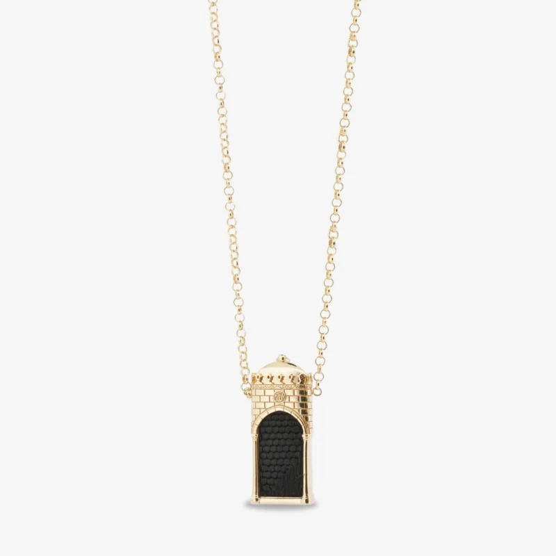 Açılabilir Kapak ve Orijinal Kiswah Dokusu Bu özel tasarımın kalbinde bir sır gizli. Kolyenin ön yüzündeki mimari kapağı açtığınızda, bizzat Kabe-i Muazzama’nın üzerini örten o mübarek Kiswah (Kabe Örtüsü) parçasından alınan orijinal bir kesit sizi karşılar. Kolyenin dış yüzeyi, Kabe’nin heybetli duruşunu simgeleyen taş duvar dokusu ve dikey hatlarla ilmek ilmek işlenmiş; gümüş üzerine uygulanan yüksek kaliteli altın kaplama ile göz alıcı bir parlaklığa kavuşturulmuştur.