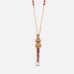 Kiswah Jewellery’nin 18 Ayar Altın Cam Tüp Kırmızı Mineli Örtülü Kolyesi, modern sanat ve manevi derinliği eşsiz bir şekilde birleştirir. Bu özel kolye, Kâbe örtüsünün kutsal kumaşının çok küçük bir parçasını şık bir cam tüpün içine yerleştirir. Bu tasarım, kutsal parçanın korunmasını sağlarken, aynı zamanda 18 ayar altının sıcak ışıltısıyla bütünleşir.